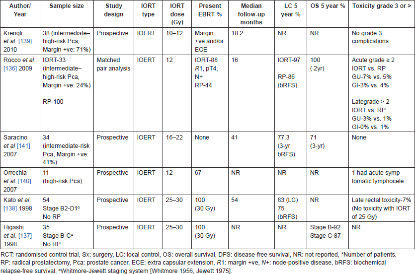 Locally advanced/high-risk prostate cancer is associated with significant risk of relapse when treated with radical prostatectomy alone, risk being the highest when the margins are positive. Adjuvant radiotherapy in this setting reduces the risk of relapse significantly [135]. IORT has been explored in high-risk prostate cancers in combination with radical prostatectomy and post-operative EBRT to improve local control via dose escalation. IORT has the added radiobiological advantage of high single dose of radiation, which improves the therapeutic gain due to low α/β of prostate. It also helps limit doses to the rectum and has been shown to have low gastrointestinal (GI) morbidity even in combination with EBRT [136]. Several small prospective series (Table 10 [136–141]) have evaluated the feasibility of this multi-modality approach in patients with non-metastatic, node-negative disease with probability of LN involvement being less than 15%. Encouraging local control and acceptable toxicity has been demonstrated even though significant proportion of patients had margin positive disease in these series [136, 139, 141]; however, long-term results are awaited.
