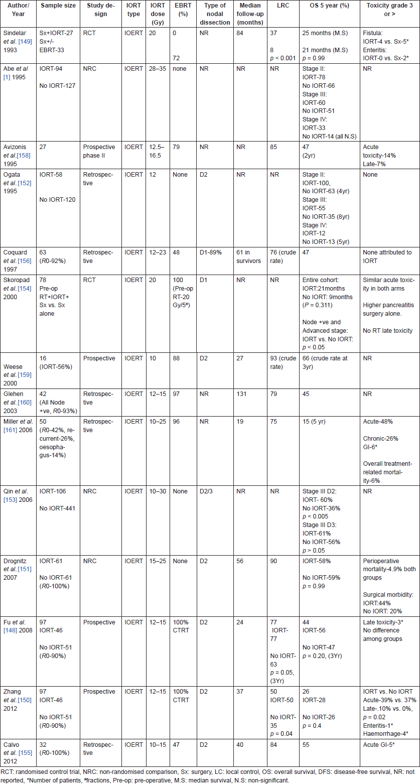 Role of IORT in gastric cancer after curative resection has been evaluated in multiple studies (retrospective, prospective, and randomised control), which have shown an improvement in locoregional control [148, 150] and survival with IORT, especially in patients with stage-II/stage-III and node-positive disease (Table 11) [1, 148, 150–154]. While initial studies of IORT involved less aggressive surgeries (D1) and infrequent use of adjuvant radiotherapy recent studies [148, 150, 153] have demonstrated a consistent benefit with IORT, even in combination with D2 resections and post-operative CTRT. Extended resections like D3 may reduce the benefit with IORT [153], however, IORT combined with a limited lymph node dissection (D1) may be associated with survival similar to extended dissection (D2/3), with lesser post-operative mortality [156]. While most studies did not show an increase in complications with the use of IORT, Drognitz et al [151] have demonstrated a significant increase in surgical complications with the use of IORT (44% vs. 20%, p < 0.05). They also did not show a benefit with addition of IORT to surgical resection. Complication rates need to be carefully weighed against improvement in locoregional control to maximise benefits with IORT [157].