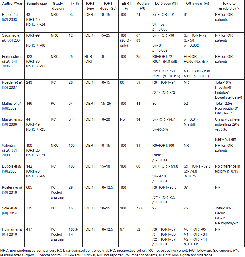 Table 3 summarises various non-randomised and randomised studies of IORT in locally advanced rectal cancers. The initial non-randomised comparisons [52–54, 57, 62] showed conflicting results with IORT after complete resection (R0), while some studies showed equivalent local control [54] in IORT and non IORT group, others showed a significant benefit in local control with IORT [52, 57, 62]. One thing which is certain was that IORT provided significant benefit in local control and survival in patients with R resection [54, 55, 59, 61]. The only two randomised studies [56, 58] comparing the addition of IORT to standard treatment failed to show any benefit with addition of IORT in terms of local control or survival. The study by Dubois et al. [58] had a large proportion of T3 tumours (89%), complete resection in most patients would have likely minimised the benefits of IORT, while on the other hand, the study by Masaki et al. [56] was limited by small sample size and inclusion of T1/T2 patients.