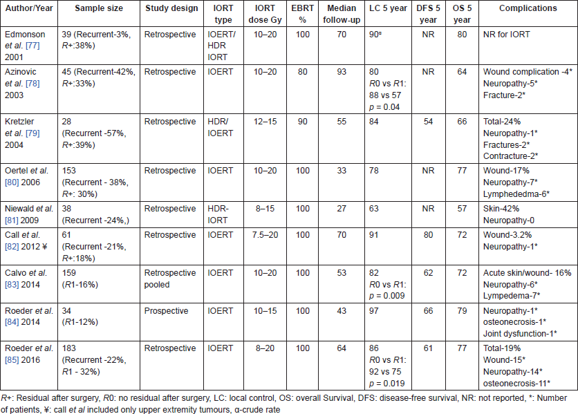 Table 5 summarises studies of IORT in extremity soft-tissue sarcomas, these studies were heterogeneous with varying proportion of recurrent tumours and incomplete resections. Use of IORT in these unfavourable patients aimed at preserving the limb while maintaining acceptable local control. IORT was mostly used in combination with function preserving surgery and moderate doses of EBRT. Recent series [82–85] of IORT demonstrate excellent LC rates and functional outcomes, comparable to the series of EBRT alone, despite including higher proportion of tumours with unfavourable factors. Dose of IORT was dependant on resection status, volume and dose of EBRT. While R disease fared equally well as R0 disease in the series by Call et al and Kretzler et al [79, 82], studies by Niewald et al and Kretzler et al [79, 81] reported equivalent outcomes in recurrent as well as primary disease. However, in some of the larger series, [82–85] resection status and recurrent disease were the most important factors determining local control. Limb preservation was achievable in most patients even with recurrent disease. The complications of neuropathy, contracture, and lymphedema were low, wound complications were the most common complications, and were not much different from that with EBRT [79–82].
