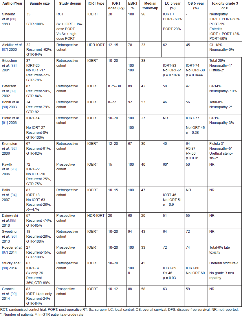 A randomised trial at the NCI [86], at a median follow-up of 8 years, showed a significantly better local control with IOERT and low-dose post-operative EBRT compared to high-dose post-operative EBRT alone (60% vs. 20%, p < 0.05). The IOERT arm experienced significantly more peripheral neuropathy attributed in part to use of concurrent radio-sensitisers (60% vs. 5%, p < 0.05), while the EBRT only arm had significantly higher GI complications. Experience from other series, summarised in Table 6, has also shown encouraging results with a favourable toxicity profile.