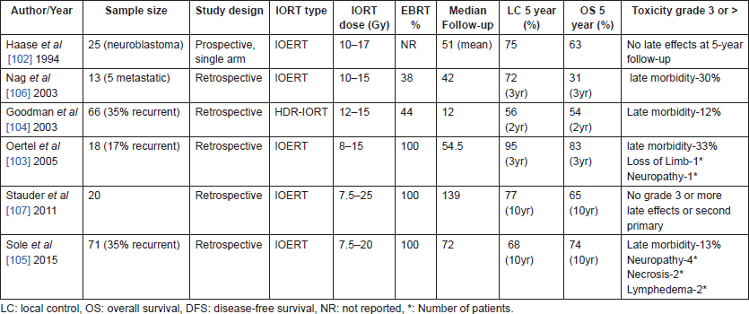 Table 7 summarises various studies of IORT in paediatric tumours, though the numbers are small, IORT has been used across a wide variety of sites and histologies, as a sole radiation modality for radio-sensitive tumours like neuroblastoma [102] or in combination with EBRT for dose escalation to improve local control in sarcomas [103] or for dose de-escalation in RMS with low-dose EBRT. Oertel [103], Goodman [104] and Sole [105] et al included quite a number of recurrent tumours. Use of IORT in combination with surgery and EBRT provided excellent local control across most studies with acceptable toxicity.