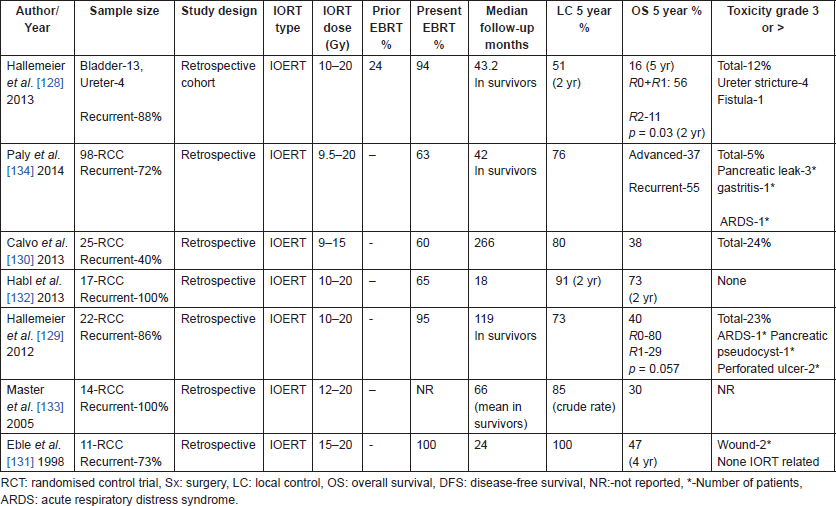 Radical surgery forms the mainstay of treatment in patients with renal cell carcinoma (RCC). However, in patients with recurrent and advanced tumours, achieving complete resection with wide margins may be difficult due to proximity to the critical structures and this effects not only the local control but survival as well [129]. Adjuvant EBRT in this setting may improve local control; however, the doses achievable with EBRT is limited due to low tolerance of the surrounding structures like stomach, small bowel, contralateral kidney, liver, and spinal cord. IORT offers an attractive treatment option to escalate doses to the tumour bed, especially in cases with positive resection margins. Studies evaluating the role of IORT in the management of locally advanced and recurrent RCC are summarised in Table 9 [129–134].