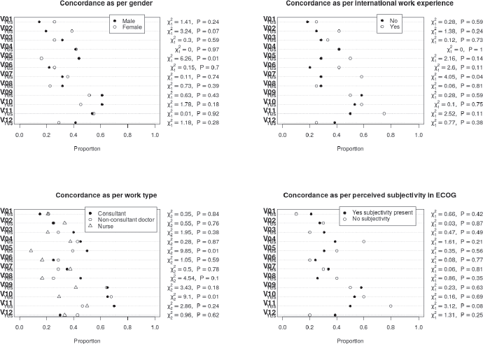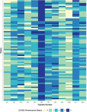 Figure 3 represents the agreement between raters when faced by various rater related variables, namely, (a) younger versus older age of the clinician (categorised based on the median age of 33 years), (b) gender of the clinician (men and women), (c) Work type (consultant doctor, non-consultant grade doctor and nursing staff), (d) Presence of international work experience (no versus yes), (e) Longer versus shorter experience of working in the field of oncology (0–3.75 years versus 3.76–61 years, the median number of years of experience in the field of experience being 3.75 and (f) Perceived belief of ECOG rating scale being subjective or not. The 12 vignettes are represented by V1, V2, V3, V4, …….V12 in Figure 3. The 72 raters are represented by each row. The lower the ECOG rating or better PS is represented by lighter shades and poorer PS are progressively represented by a darker shade end with deep blue colour that representing ECOG 4. As is evident from visual inspection of the heatmap, there is considerable variability in ECOG rating and no clear pattern emerges based on the above rater related factors.