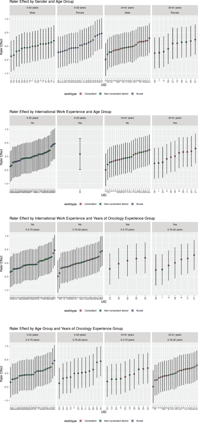 There was also significant rater effect and rater number 9 who tended to rate the PS as best was compared to rater number 70 who rated the PS as worse. A graphical exploration of the patterns of rater effect on the rating given revealed that raters who were younger nurses with lesser experience in the field of oncology tended to give a better PS score. Also, younger and less experienced non-consultant clinicians tended to give a poorer PS score.