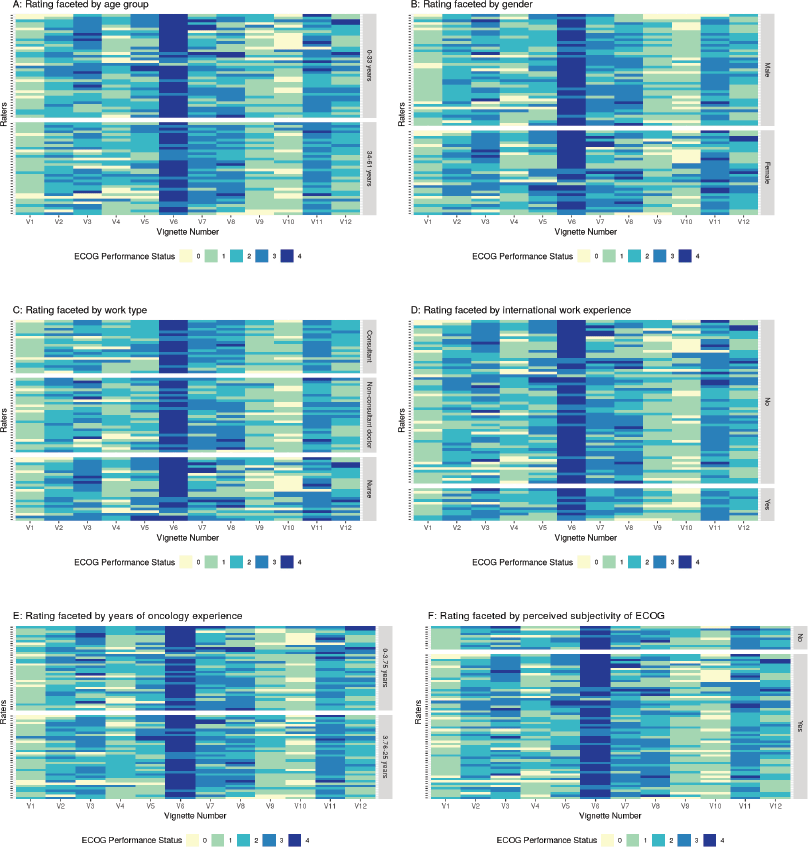 Figure 3. Figure showing the rating given by different raters faceted by the rater characteristics. Panel A: Faceting by age group, Panel B: Faceting as per gender, Panel C: Faceting by work type, Panel D: Faceting by international work experience, Panel E: Faceting by years of oncology experience, Panel F: Faceting by perceived subjectivity in ECOG rating.