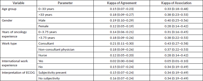 Conclusion: There is considerable variability in ECOG PS determined by clinicians. Decision-making in oncology is complex, multifactorial and is influenced by rater and patient-related factors.