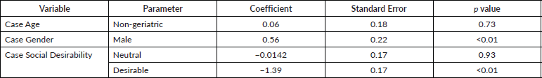 We also investigated if the rating was influenced by the characteristics of the patient in the particular vignette. In order to check this, a CLMM was fitted investigating the effects of three variables; age (geriatric or non-geriatric), gender (male or female) and social desirability (desirable or neutral) of the patient described in the vignette. The final fitted model showed that raters tended to rate the PS worse if the vignette included a patient who was female and lacked in ‘social desirability’ as defined a priori.