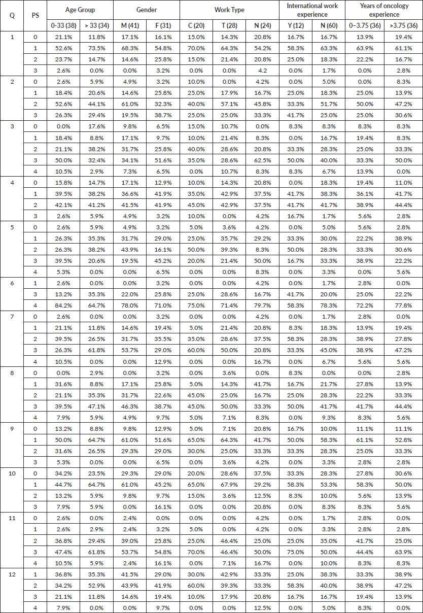 Table 4. Percentage of raters giving a specific rating for each question as per the rater characteristics. Q: Question number. PS: ECOG PS score, Age group: Age split by median age, Experience group: Years of oncological experience by median, M: Male, F: Female, C: Consultant, T: Trainee Physicians, N: Nurses, Y: Yes, N: No. Shaded table rows represent the golden rating.