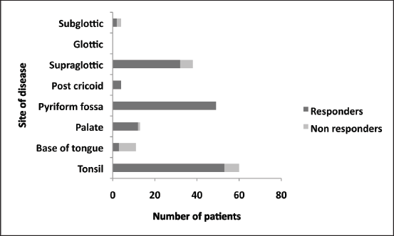 Patients with hypopharyngeal tumours were noted to have highest response rates of the primary site, whereas base of tongue tumours had lowest response (Figure 1).