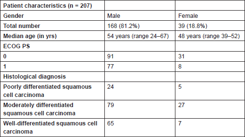 A total of 207 patients with inoperable locally advanced head and neck cancer who attended our institute from November 2010 to October 2013 were studied. Patients were considered inoperable either given the extent of disease or because of medical comorbidities not allowing surgery. A majority had a histological diagnosis of squamous cell carcinoma. All patients were with Eastern Cooperative Oncology Group (ECOG) performance status of either 0 or 1 (Table 1).