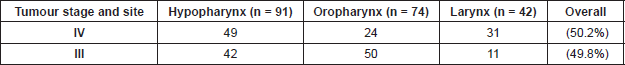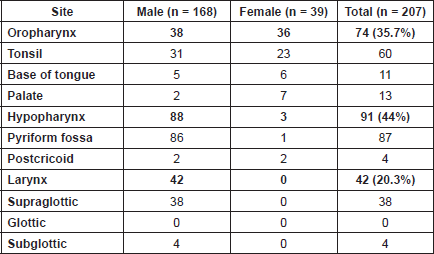 Among them 81% patients were males forming the larger part of the study group. Moderately differentiated squamous cell carcinoma was the commonest histological type of tumour, comprising 51.2% of all tumours. The commonest site of disease was hypopharynx constituting 44% of patients, followed by oropharyngeal tumours (35.7%). Laryngeal tumours formed 20% of the study cohort and consisted exclusively of males (Table 2).